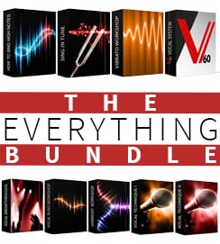 The Everything Bundle includes: V60 Vocal System, Vocal Runs Workshop, Harmony Workshop, Vibrato Workshop, How to Sing High Notes, Vocal Technique I and II, Sing in Tune, and Vocal Breakthroughs.
